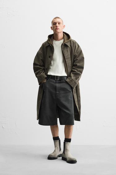 Тренч оверсайз из хлопка с эффектом потертости. Воротник с лацканами и длинные рукава. Прорезные карманы на бедрах. Застегивается на пуговицы под планкой.