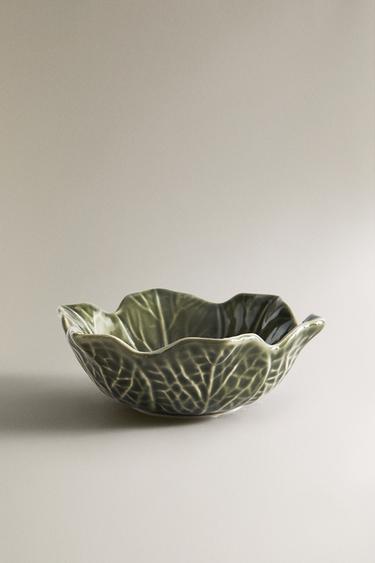 Stoneware bowl with a cabbage leaf-shaped design.